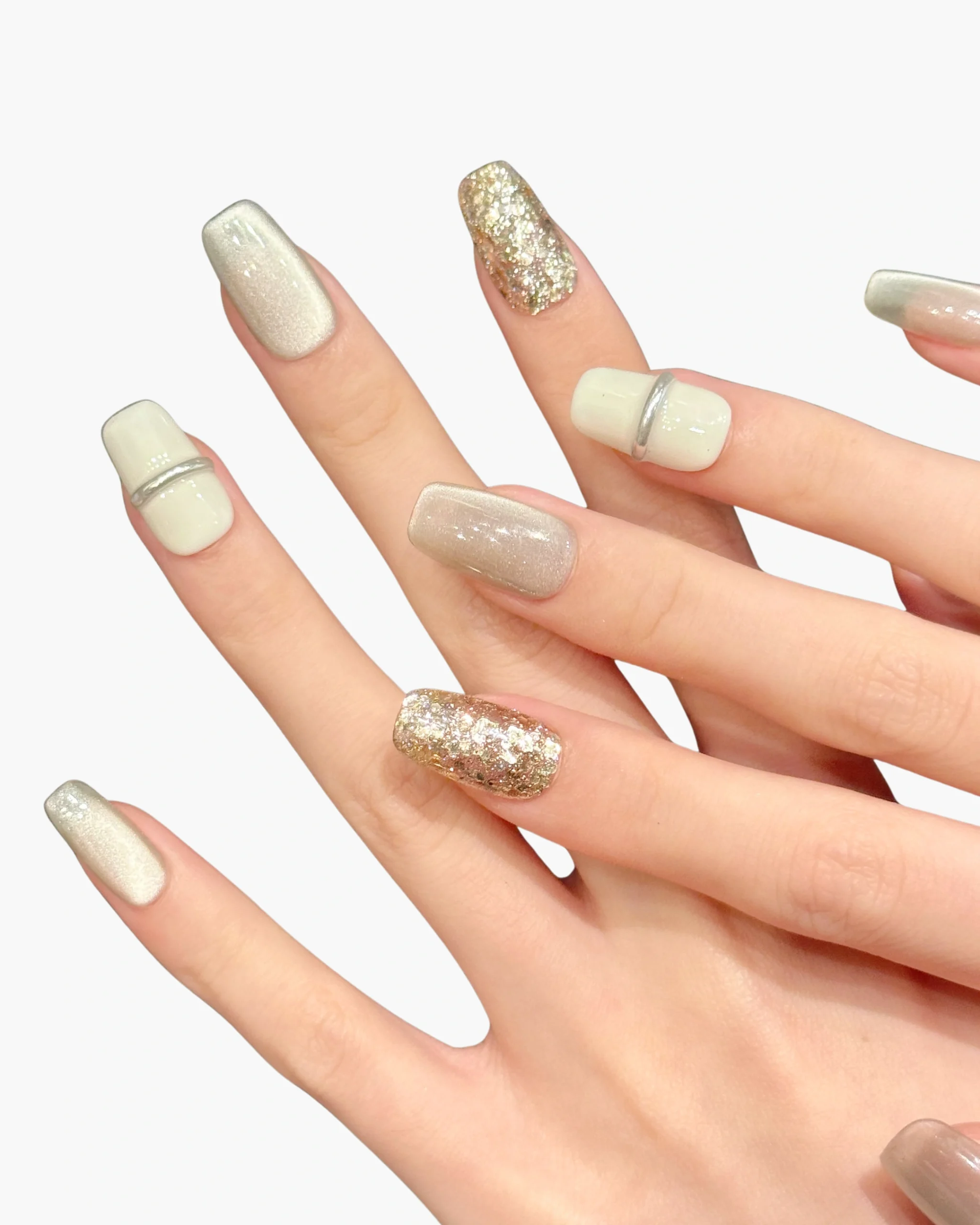 - Handmade press-on nails blending muted stone-grey tones with crisp white and liquid silver accents